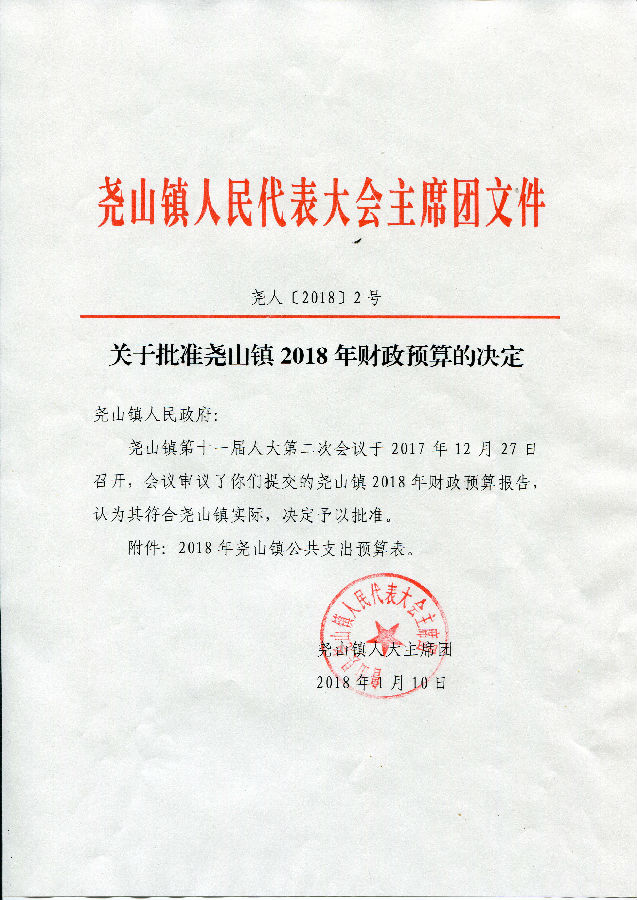 尧山镇第十一届人大第二次会议于2017年12月27日召开,会议审议了尧山镇2018年财政预算报告,认为其符合尧山镇实际,决定予以批准。
